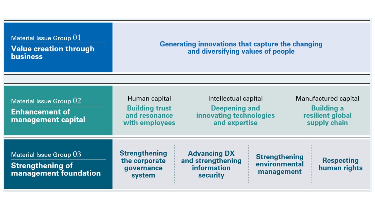 These material issues are divided into three groups: value creation through business, enhancement of management capital, and strengthening of management foundation. Within value creation through business, we aim to create new innovations that meet and exceed consumer needs, in line with the core concept of our Basic Policies for 2030 Goal Achievement. Enhancement of management capital and strengthening of management foundation are designed to support achievement of value creation through business. With particular emphasis on three kinds of management capital—human capital, intellectual capital, and manufactured capital—we have selected issues under four themes to achieve strengthening of management foundation.