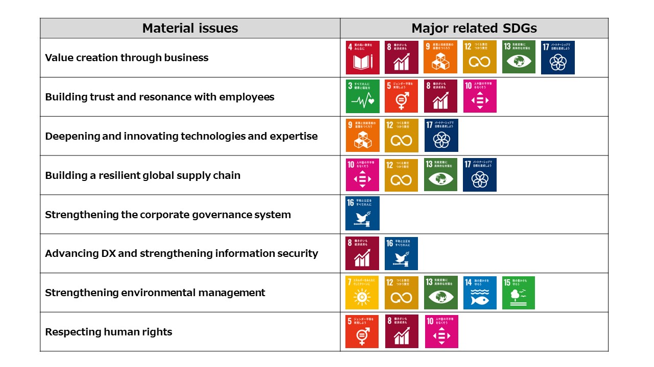 Initiatives for each material issue contribute to the achievement of the Sustainable Development Goals (SDGs), and we will proactively advance each with the aim of resolving issues and providing this contribution.