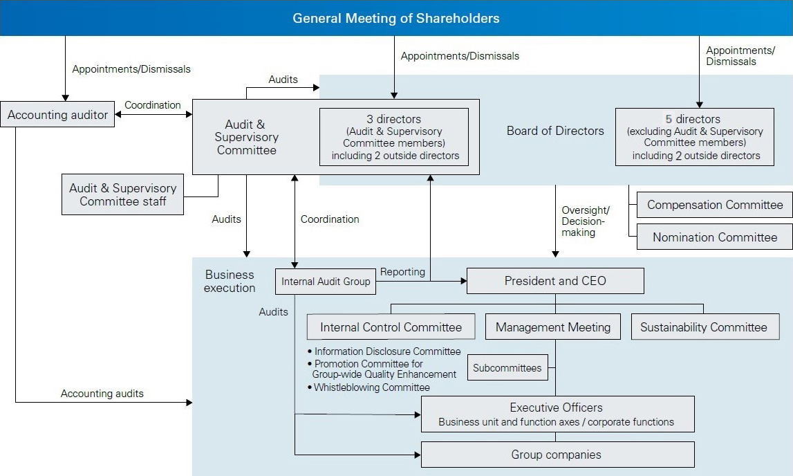 Casio now has a system in place for appropriate oversight of management decision-making and monitoring of progress related to important sustainability issues, including climate change. The Sustainability Committee works closely with the Management Meeting, and its membership mainly consists of the CEO, CHRO, CFO and the heads of each business and each functional headquarters, who manage business operations. The committee fully discusses important sustainability issues and reports the results to the Board of Directors.