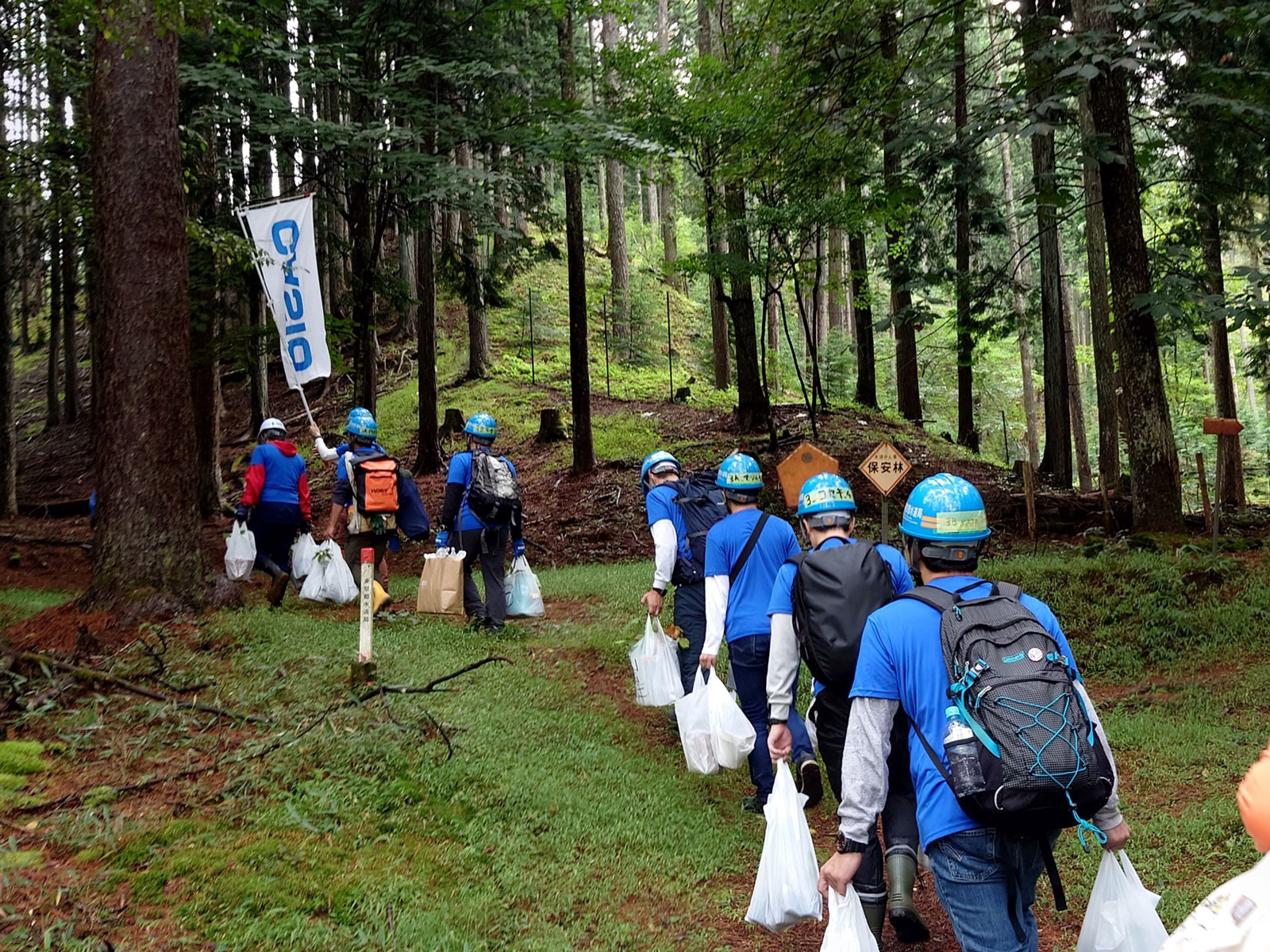 Carrying Mongolian oak seedlings raised by employee volunteer “acorn foster parents” to the site for supplementary planting with guidance from experts