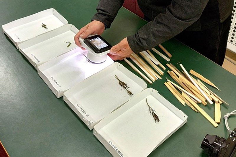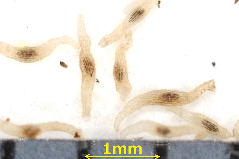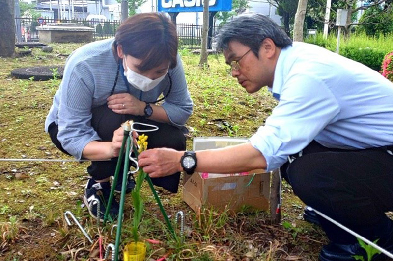 At the Hamura R&D Center, reconstruction of the building is scheduled for the near future due to its aging. Therefore, in preparation for the eventuality that transplantation becomes necessary, the center referred to academic literature and planted young trees (Quercus serrata, Lithocarpus edulis) from species that can form a symbiotic relationship with the Golden Orchid, so that this orchid and these trees can be transplanted together. In addition, the Hamura TC Protection Team is making new improvements and refinements every year to avoid the effects of the orchid fly during the flowering season. At the end of the flowering season, artificial pollination is carried out to obtain seeds, and in 2024, the team began attempts to sow seeds using the “seed stick method,” with reference to academic literature.