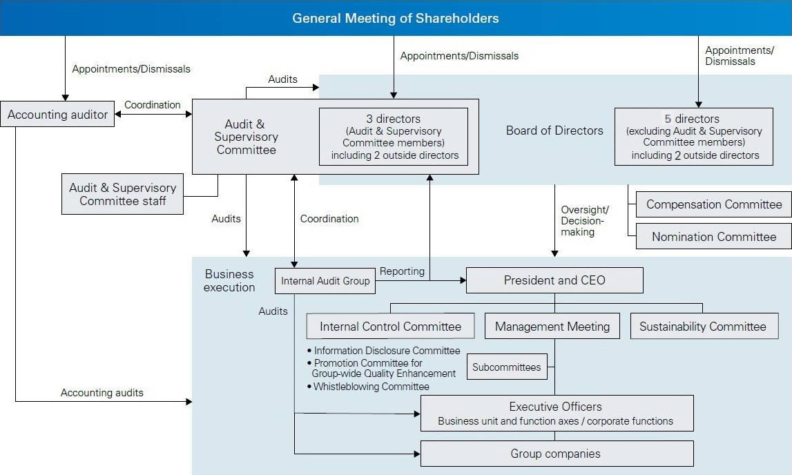 To promote sustainable growth and medium- to long-term improvements to our corporate value, we position swift decision-making, the proper performance of duties, and strengthening our management oversight functions as core issues for the Company. To ensure appropriate responses to these issues, we are strengthening the Board of Directors’ oversight functions. To accelerate and optimize business execution based on appropriate supervision by the Board of Directors, with a resolution passed on June 27, 2019 at the General Meeting of Shareholders, we switched to a company with an Audit & Supervisory Committee structure. Currently, the Board of Directors has eight members, with at least half of the seats reserved for outside directors to strengthen its oversight function.