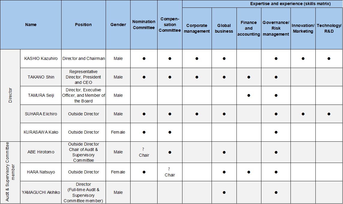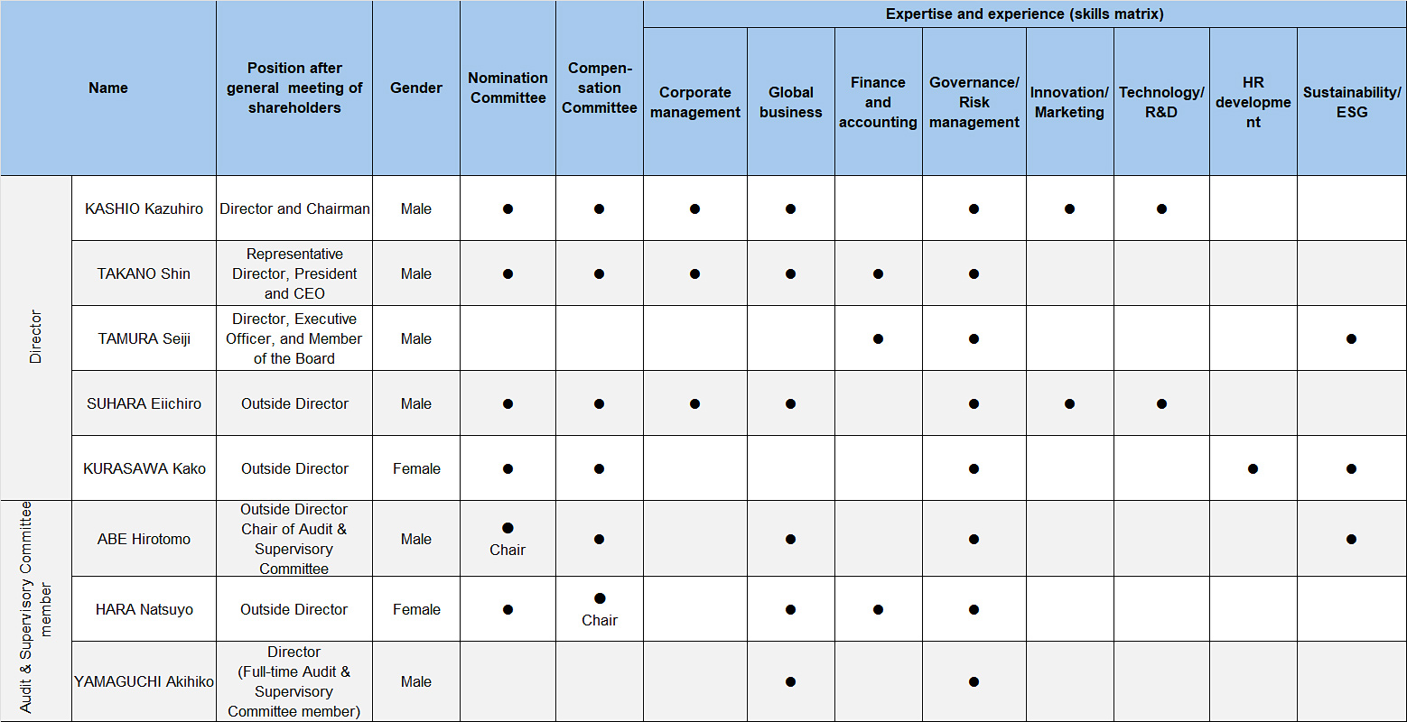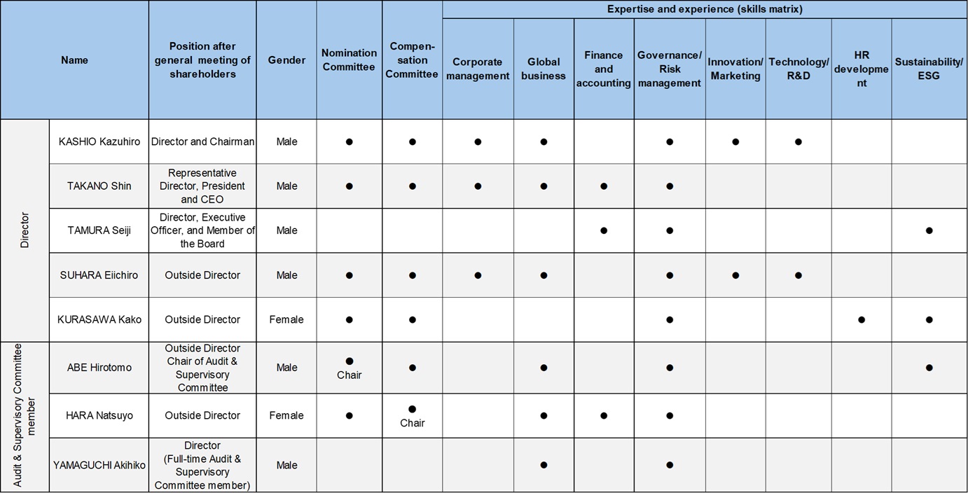 For the selection of director candidates, a skills matrix has been prepared presenting an overview of the knowledge, experience, abilities, and other attributes expected of directors (please see “Composition of the Board of Directors”). In addition to the expertise and experience indicated in the matrix, the selection of director candidates aims to achieve a balance in terms of diversity, affiliations (independence), years of service, and other attributes. With additional consideration given to changes in the business environment and other factors, the aim is to achieve a Board of Directors in which composition will promote the strengthening of corporate governance and corporate value increase.