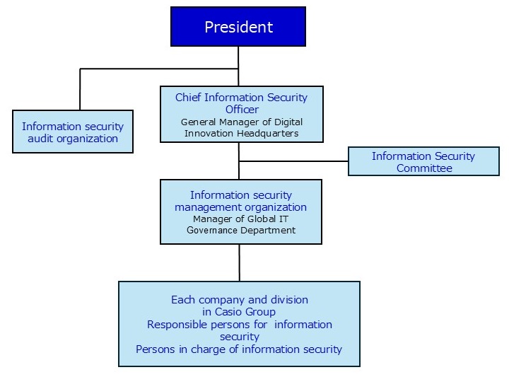 Casio has established “strengthening information security” as one of its material issues and is taking various measures to address it under an implementation system headed by the president. The Information Security Committee, chaired by the general manager of the Digital Innovation Headquarters and composed of members selected from each department, ensures the consistency and effectiveness of group-wide information security measures.