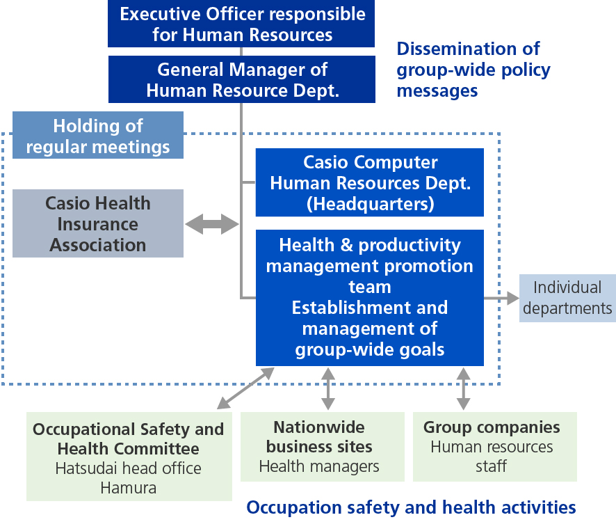 The Health and Productivity Management Promotion Team in the Human Resources Department cooperates closely with the Casio Health Insurance Association to encourage various measures to promote health and productivity. In addition, the Occupational Safety and Health Committee works to incorporate the opinions of employees on health and productivity management.