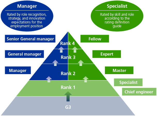 Casio revised its rating system for management positions in fiscal 2022 to clarify the roles and skills of specialists for each rating to enable career paths and growth not only as managers but also as specialists to ensure a concrete vision. The common definition table for all occupational categories has been enhanced, and definition tables specific to occupational categories have been clarified as well. In addition, the list of names for specialists, which previously existed in an intermixed form, has been properly arranged.