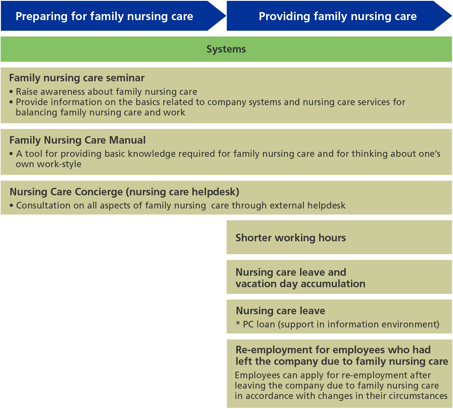 We have also introduced a system that allows all employees, not just those providing care, to work flexibly, including staggered working hours and working from home with breaks in between. We will continue to improve our systems so that those providing care can balance their work and caring responsibilities with minimum physical or psychological burden.