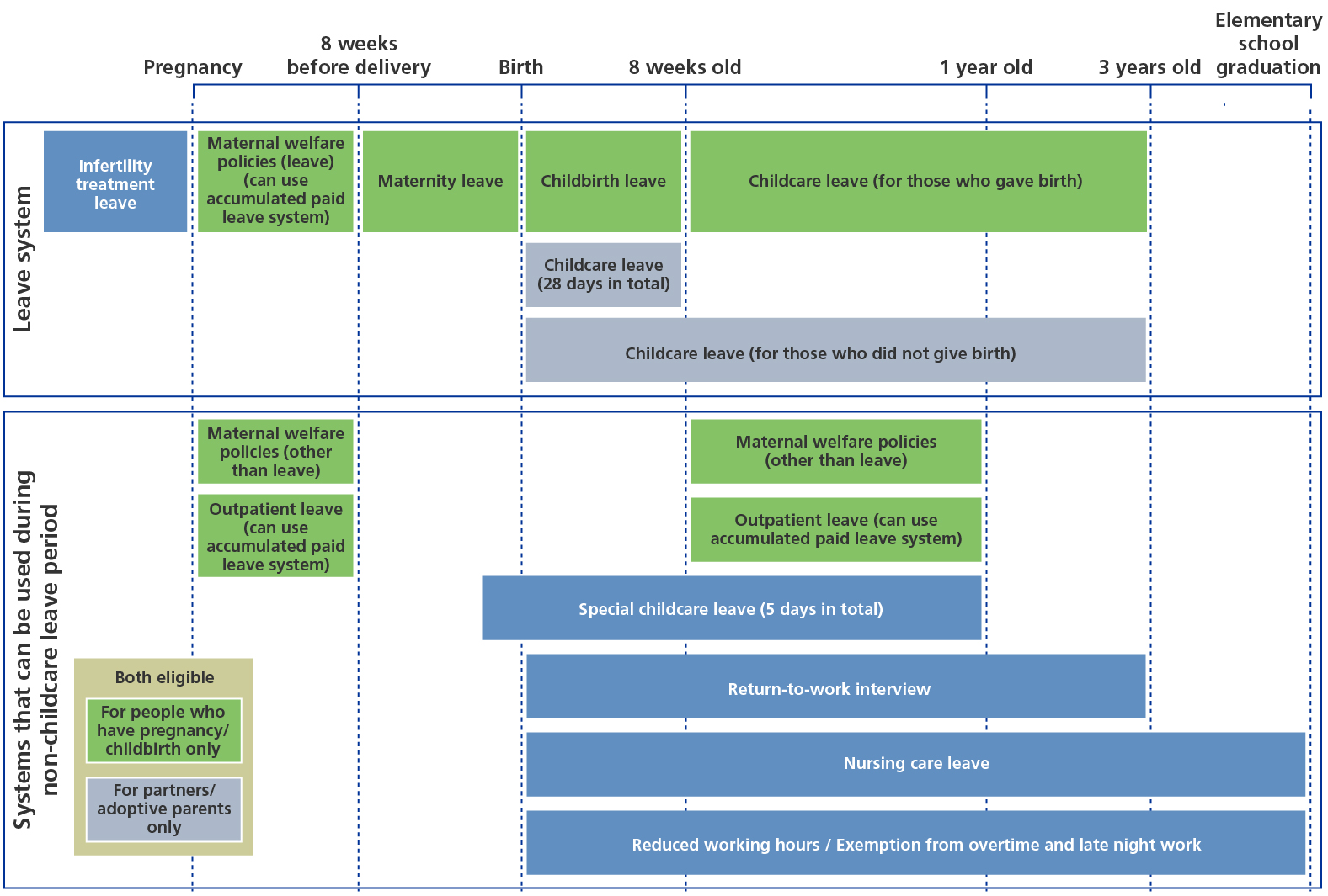 | Childcare leave | A system that allows employees who are raising children under the age of three to take time off work | Can be taken in up to four separate blocks up to the day before the child’s third birthday |