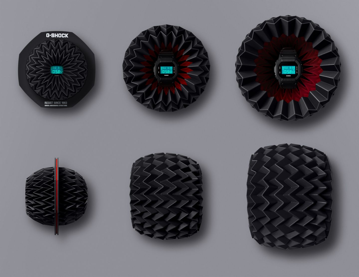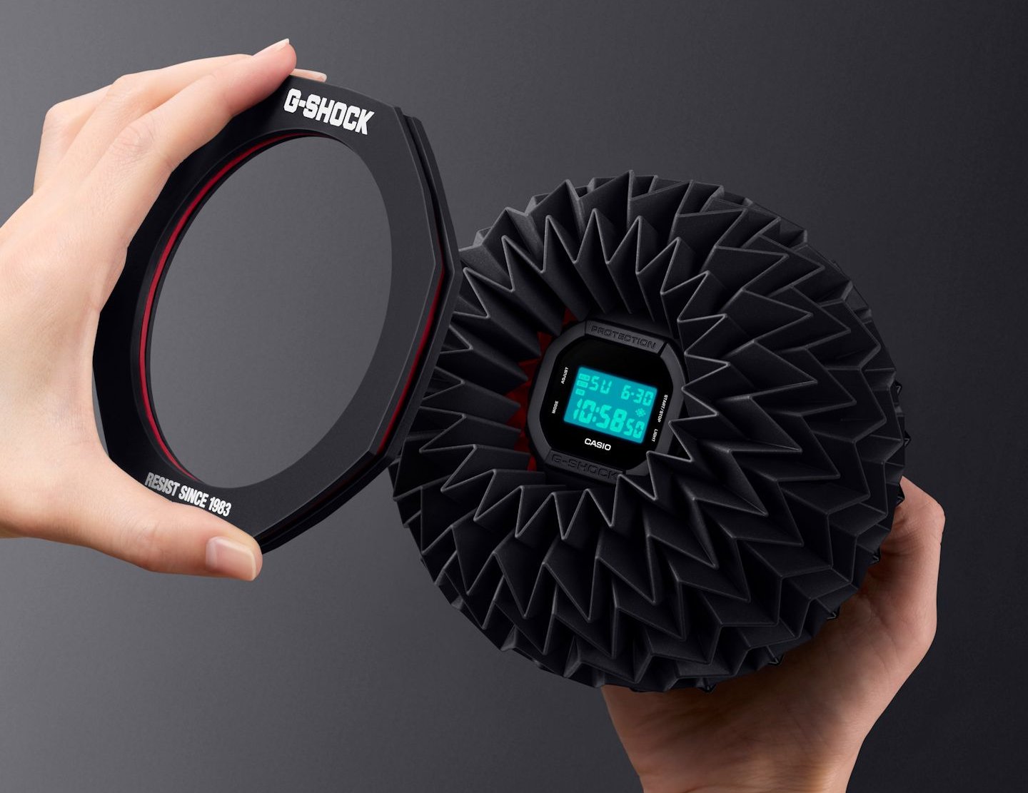 As a new interpretation of the “toughness” that G-SHOCK has pursued, this packaging structure employs the Miura fold*2 to express resilience — the ability to respond flexibly to impact. The design features a stylish approach where the product is placed inside the Miura-folded paper packaging that expands and contracts and is secured with a signature G-SHOCK octagonal ring.