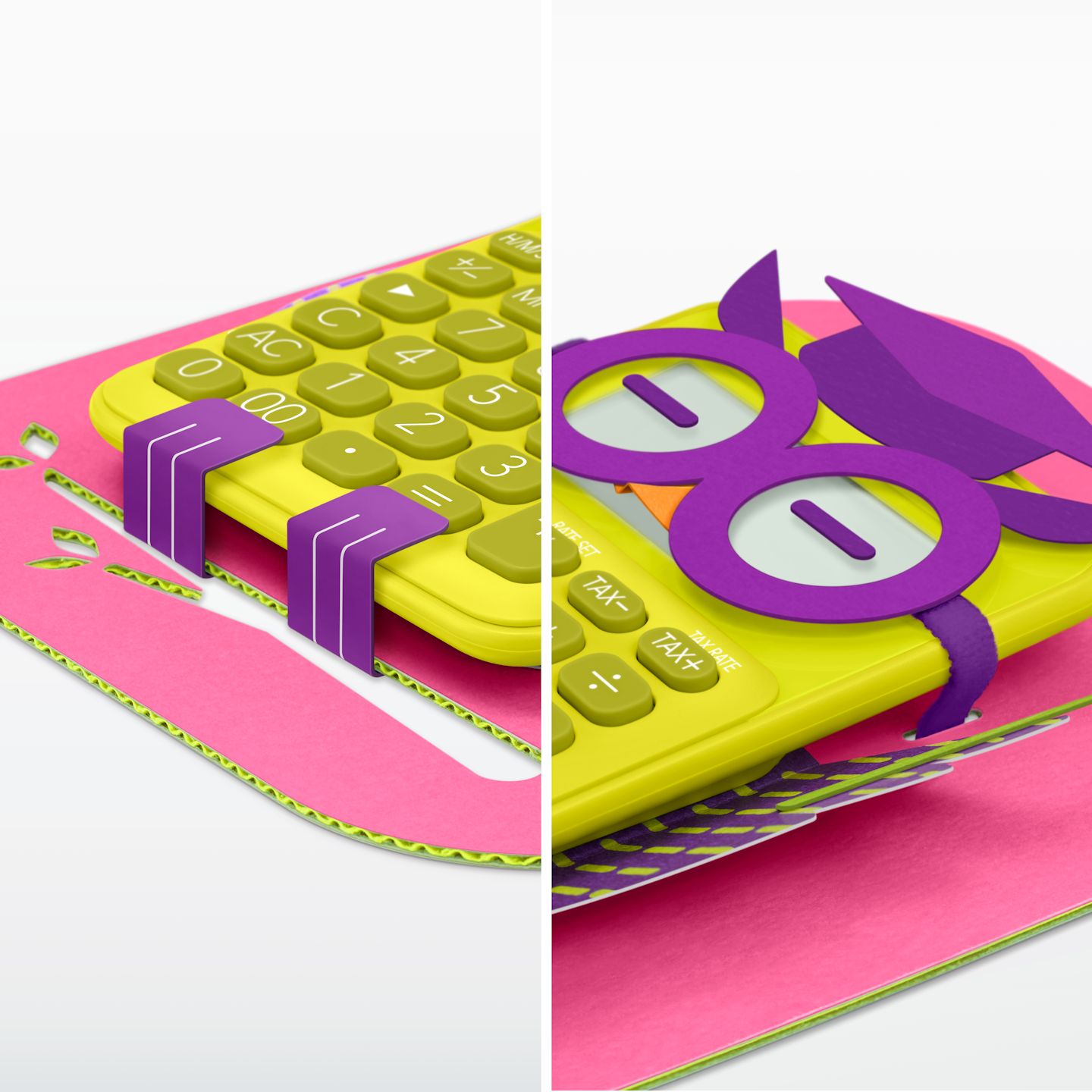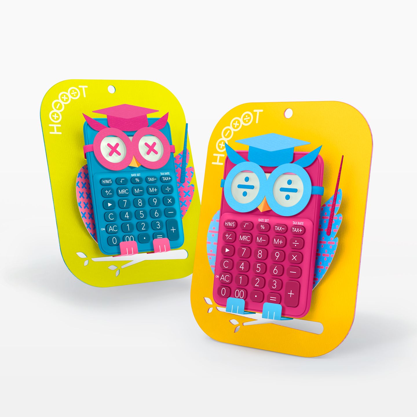 This charming calculator packaging features an owl — a symbol of intelligence — and is designed to invite children to calculate. The unique and colorful design incorporates the familiar calculator key symbols (+, −, ×, ÷) into the owl’s eyes and feather patterns.